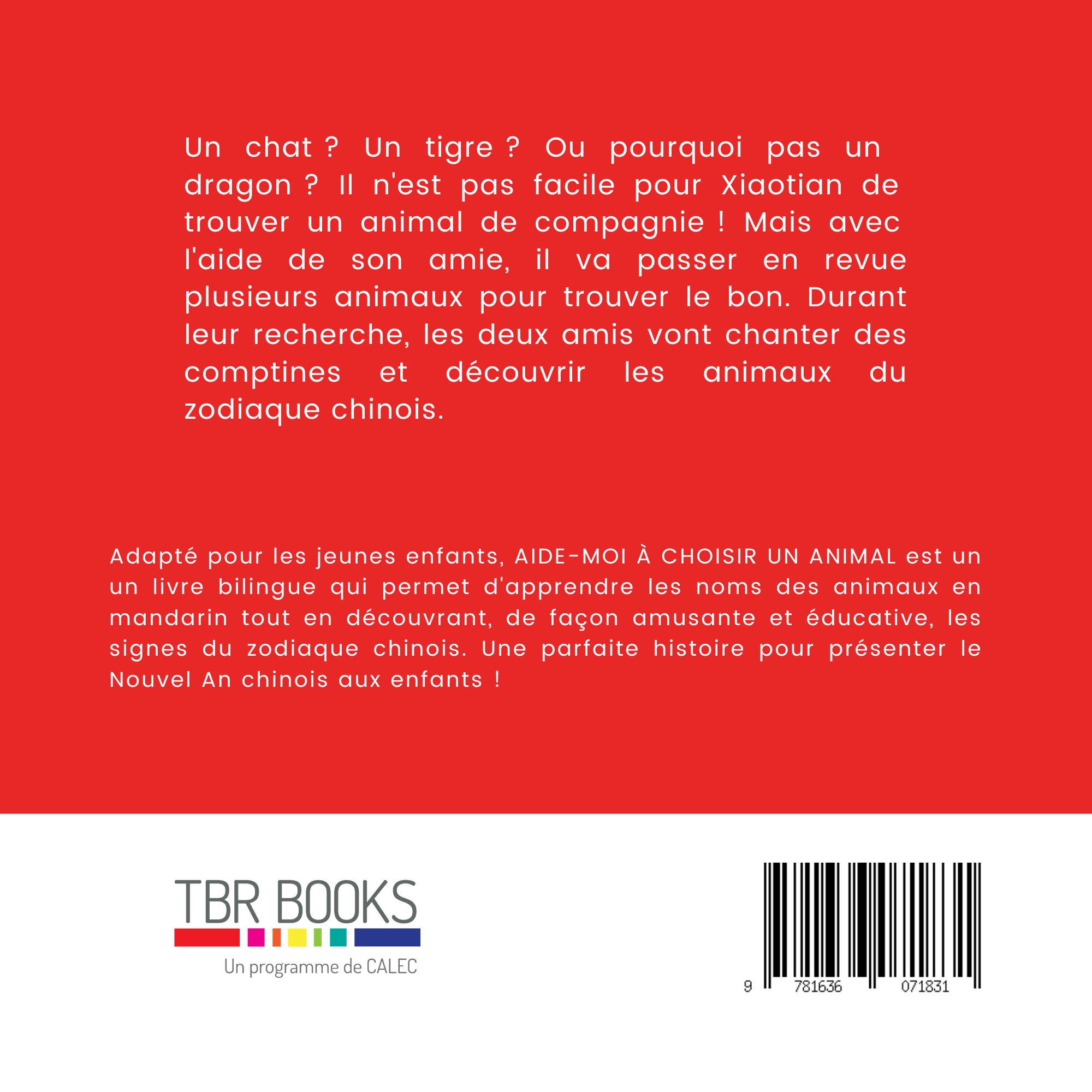 Aide-moi à choisir un animal est un livre bilingue qui s’adresse aux enfants et aux parents qui aiment les bonnes histoires, veulent apprendre les noms d’animaux en mandarin et aimeraient s’amuser en découvrant leur signe chinois. Il raconte l’histoire de Xiaotian, un garçon à la recherche d’un animal qui pourrait devenir son animal de compagnie. Lui et son amie explorent les caractéristiques d’un large éventail d’animaux alors qu’ils cherchent le parfait compagnon. Durant ce processus, ils chantent des chansons et découvrent quels animaux font partie des signes du zodiaque chinois.