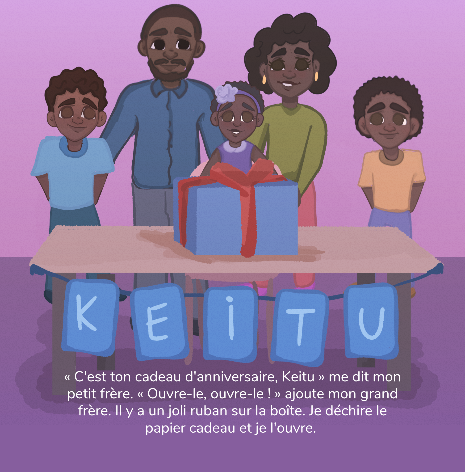 Demain, c’est l’anniversaire de Keitu ! Elle a tellement hâte de porter sa robe bleue spéciale. Dans la famille de Keitu, les anniversaires et les fêtes sont marqués par le port de vêtements confectionnés dans un tissu familial cher à leur cœur : un tissu bleu à petits pois blancs. Chaque membre de la famille choisit son propre style, mais le tissu est toujours le même, tissant ainsi un magnifique lien de tradition et d’unité à travers chaque tenue.