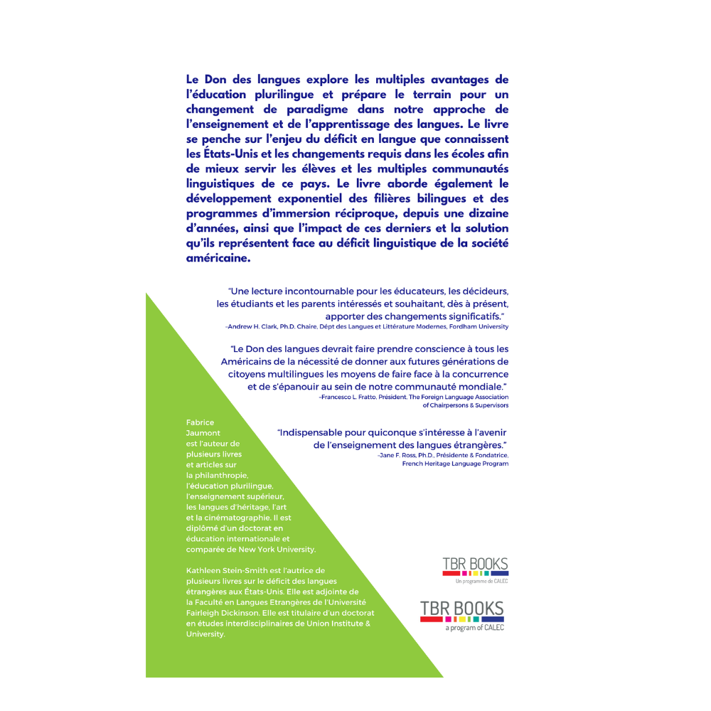 Président de la Foreign Language Association of Chairpersons and Supervisors« Maîtriser les langues est essentiel pour communiquer avec les autres et les comprendre, pour se respecter mutuellement et pour apprécier nos héritages et nos racines. The Gift of Languages offre une boîte à outils inestimable aux décideurs politiques, aux éducateurs, aux familles et aux étudiants déjà engagés dans le domaine des langues, ainsi qu’à ceux qui souhaitent provoquer le changement de paradigme défendu par les auteurs. Le livre présente des arguments convaincants en faveur de l’élargissement de l’apprentissage des langues à tous les niveaux, et plaide particulièrement pour le développement de la diversité et de l’étendue des opportunités éducatives multilingues déjà présentes dans les systèmes scolaires publics, de l’Utah à la Louisiane, en passant par New York et au-delà. Les auteurs citent des exemples de la “révolution bilingue” déjà en cours et fournissent des arguments et des exemples qui trouvent un écho chez les éducateurs et orientent les politiques vers une meilleure valorisation de l’enseignement des langues aux États-Unis. Cet ouvrage est indispensable à toute personne qui s’intéresse à l’avenir de l’enseignement des langues étrangères. »