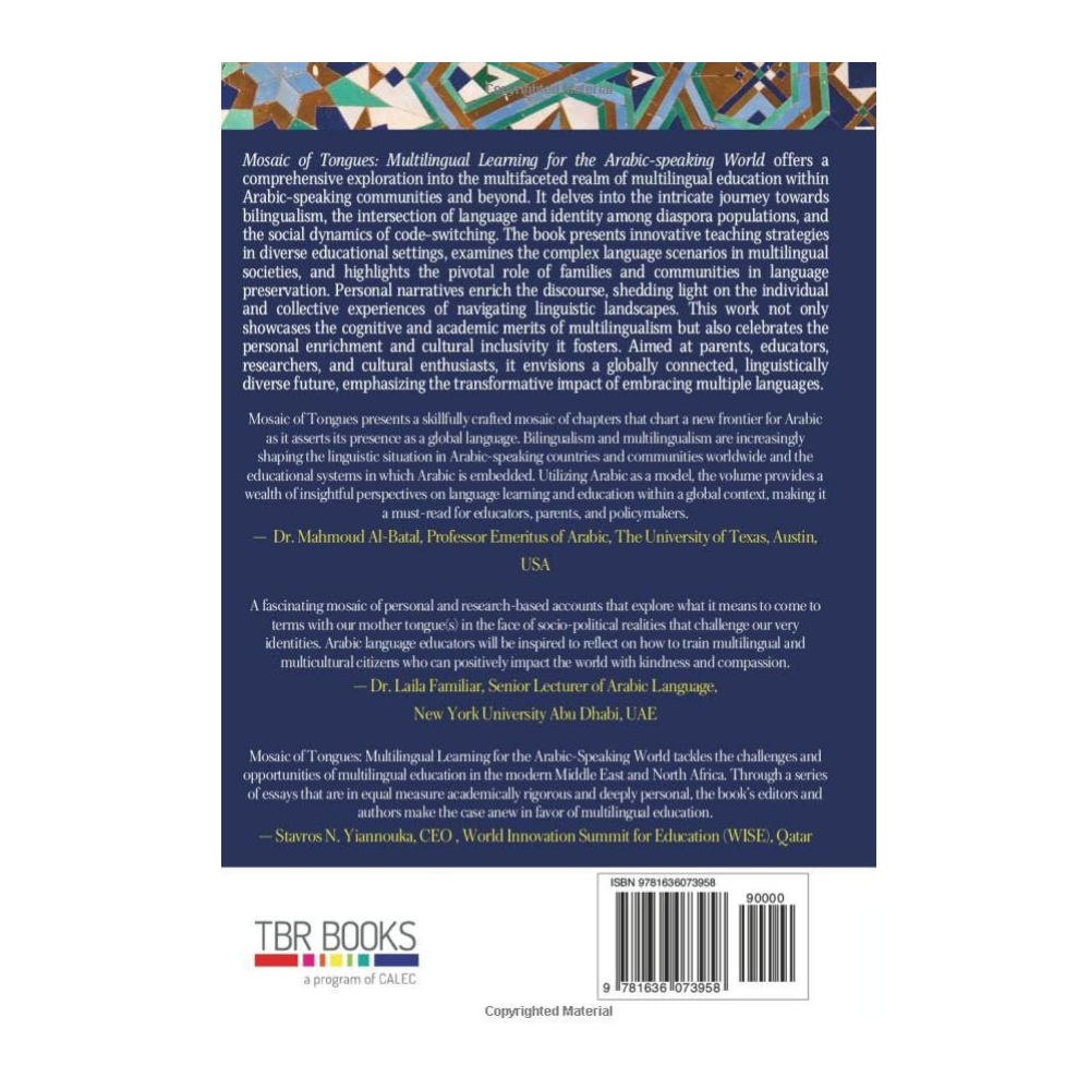 Mosaic of Tongues : Multilingual Learning for the Arabic-Speaking World réunit récits personnels et analyses universitaires pour offrir une vision nuancée et profondément humaine du bilinguisme. Porté par les contributions de 24 auteurs, ce livre explore les enjeux de l’identité, de la transmission linguistique et des pratiques éducatives au sein des communautés arabophones et de leur diaspora.